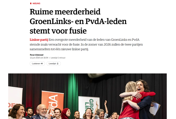 “Bij eerdere ledenraadplegingen kon de samenwerking ook steeds rekenen op brede steun in beide partijen. Tegen een fusie klonk wel meer verzet, onder meer vanuit een groep PvdA-prominenten onder leiding van oud-partijleider Ad Melkert. De tegenstanders vrezen dat sociaaldemocratische waarden ondergesneeuwd raken. Ook binnen GroenLinks is er een beweging die waarschuwt voor ideologische uitholling.”